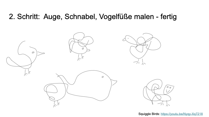 Um zu zeigen, wie leicht der Einstieg ins Zeichnen sein kann, nutze ich gerne die Methode der „Squiggle Birds“(Kringelvögel) von Chris Glynn. Dabei wird ein einfacher Kritzel – ein willkürlicher Strich oder Kringel – in einen Vogel verwandelt. Mit ein paar Strichen entstehen Schnabel, Augen, Beine – und plötzlich blickt einen ein kleiner, frecher Vogel vom Papier an.